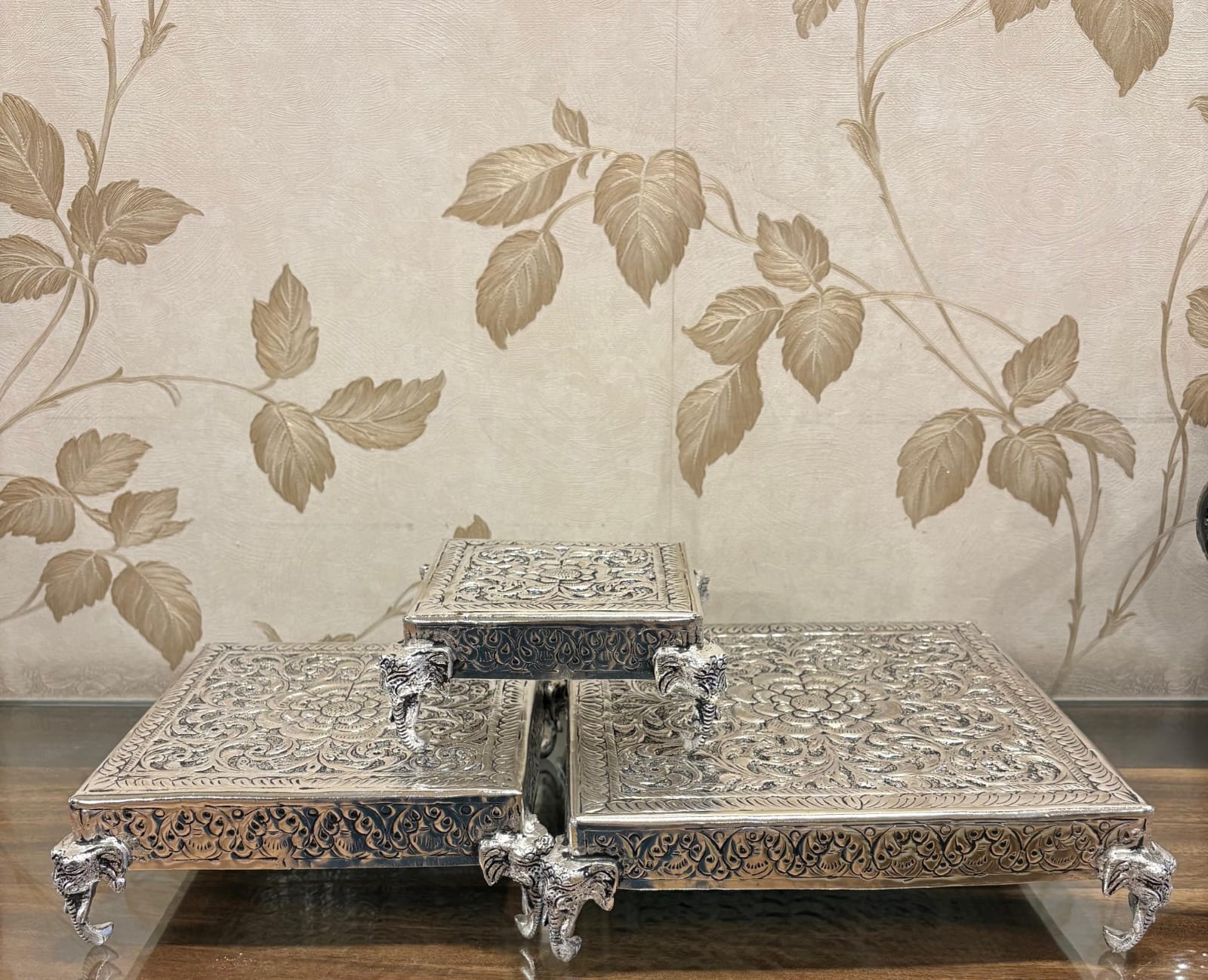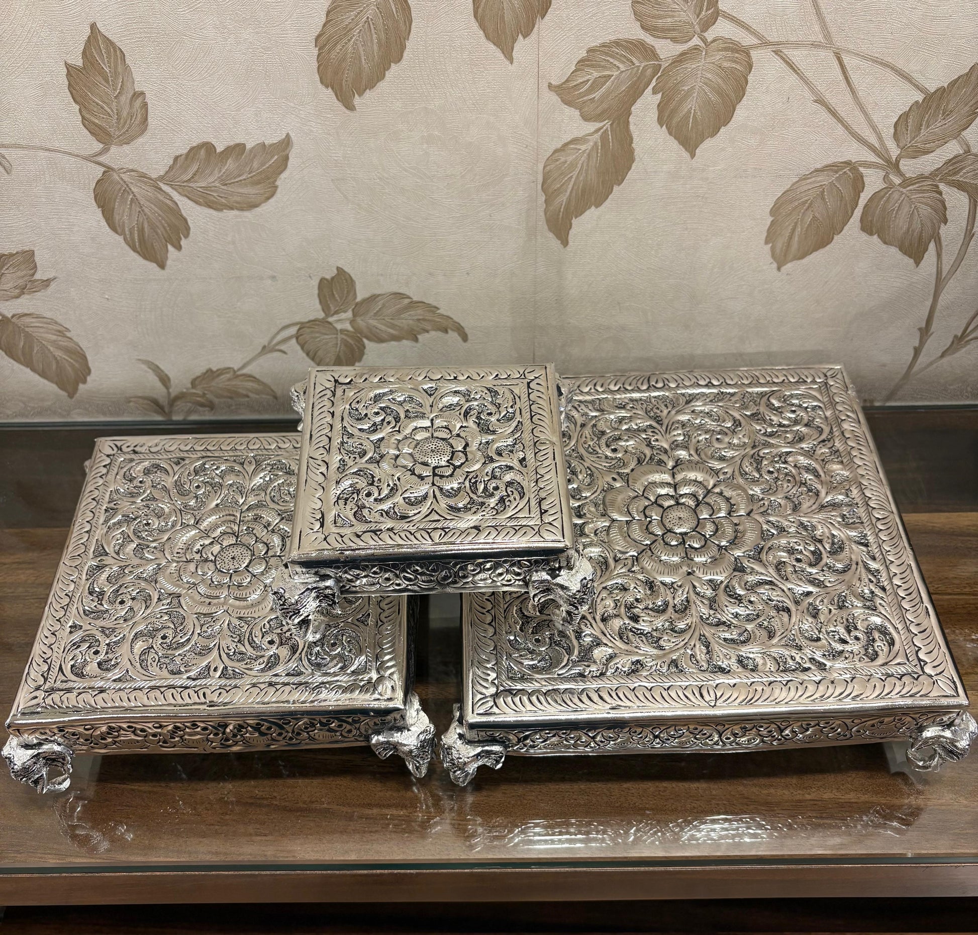 Add a touch of elegance and tradition to your home décor with this intricately handcrafted silver-plated chowki. Designed with detailed floral embossing and elegant carved legs, it serves as a beautiful base for idols, décor accents, or festive setups.