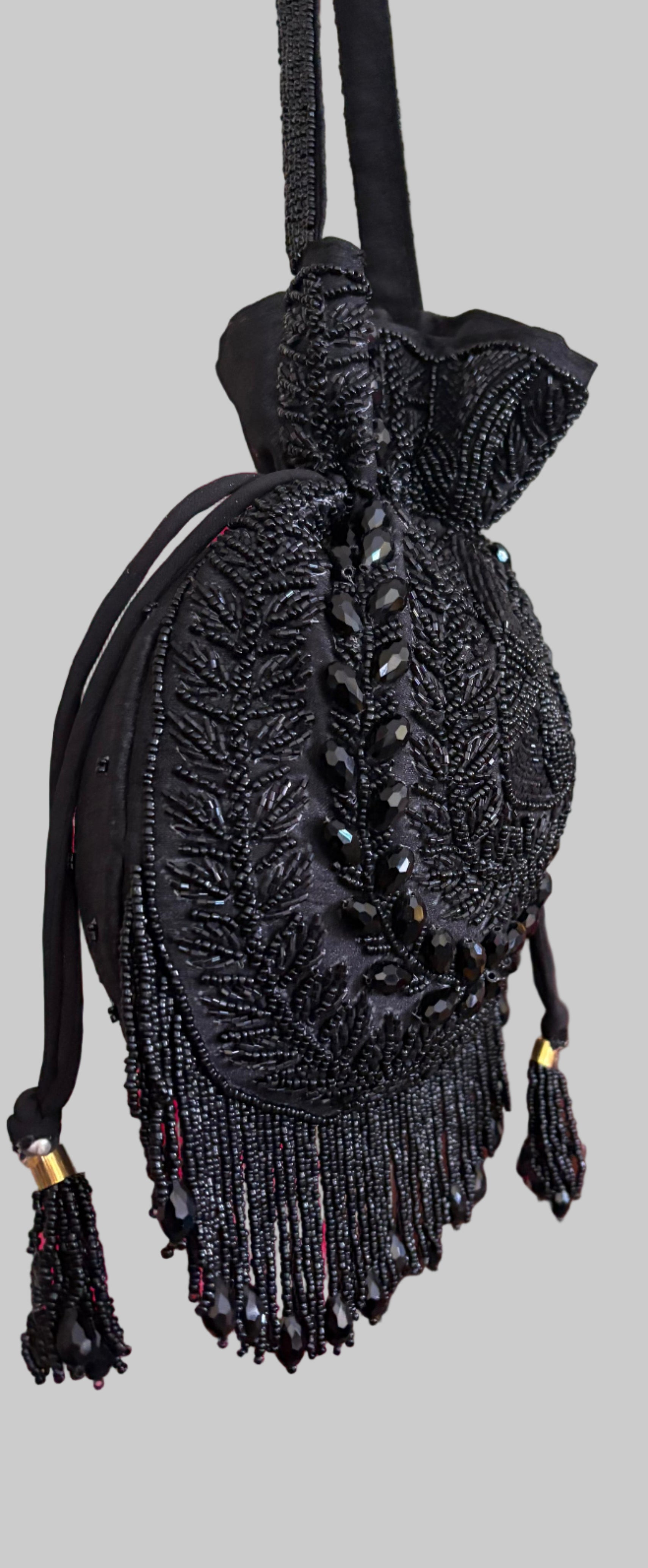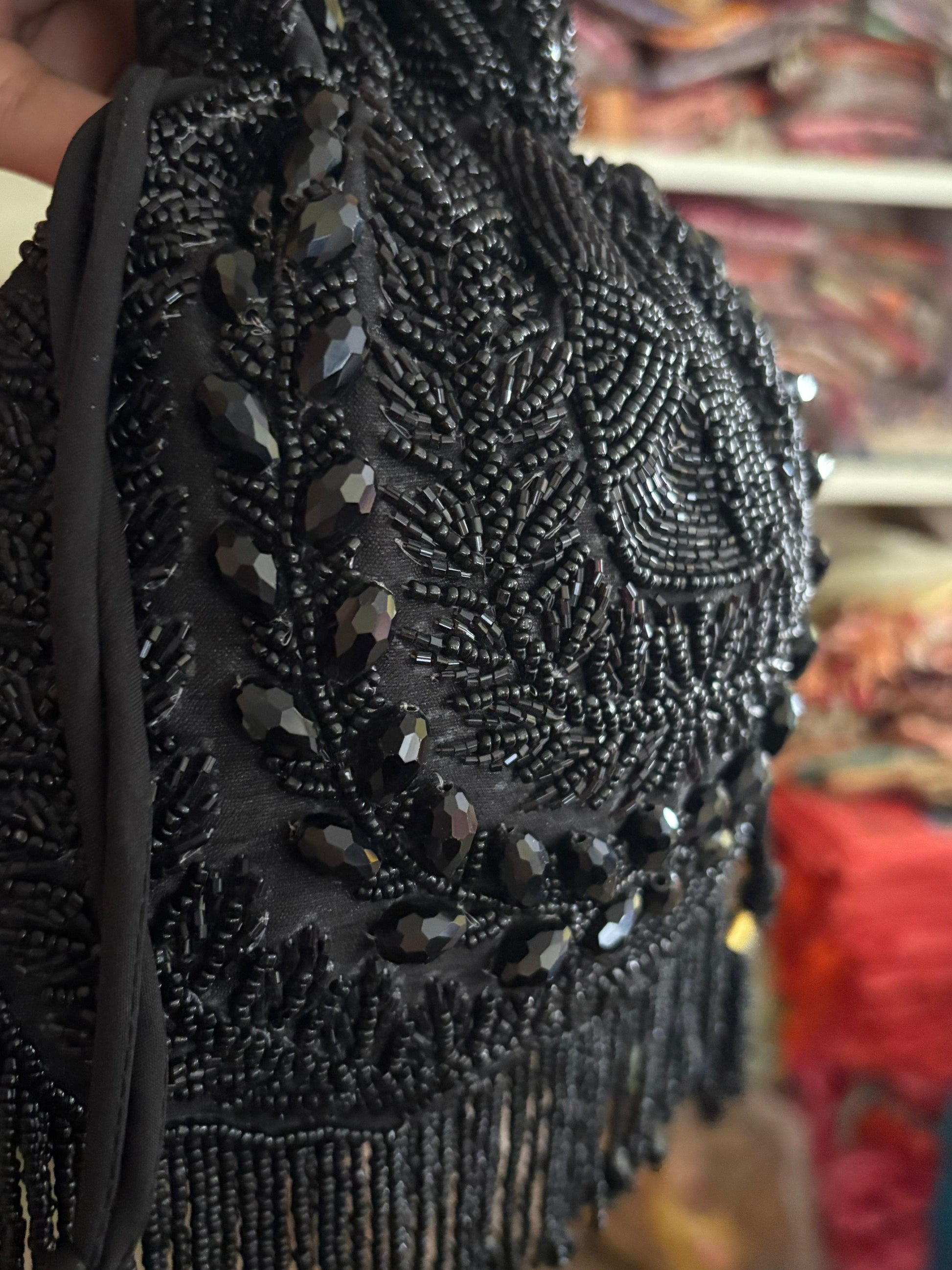 Elevate your festive and evening style with our exquisite Crystal Black Potli. Handcrafted with meticulous detailing, this potli features intricate crystal and bead embroidery that adds a luxurious shine to any ensemble. The rich black tone exudes sophistication, making it a timeless accessory for weddings, festive occasions, and elegant soirées.