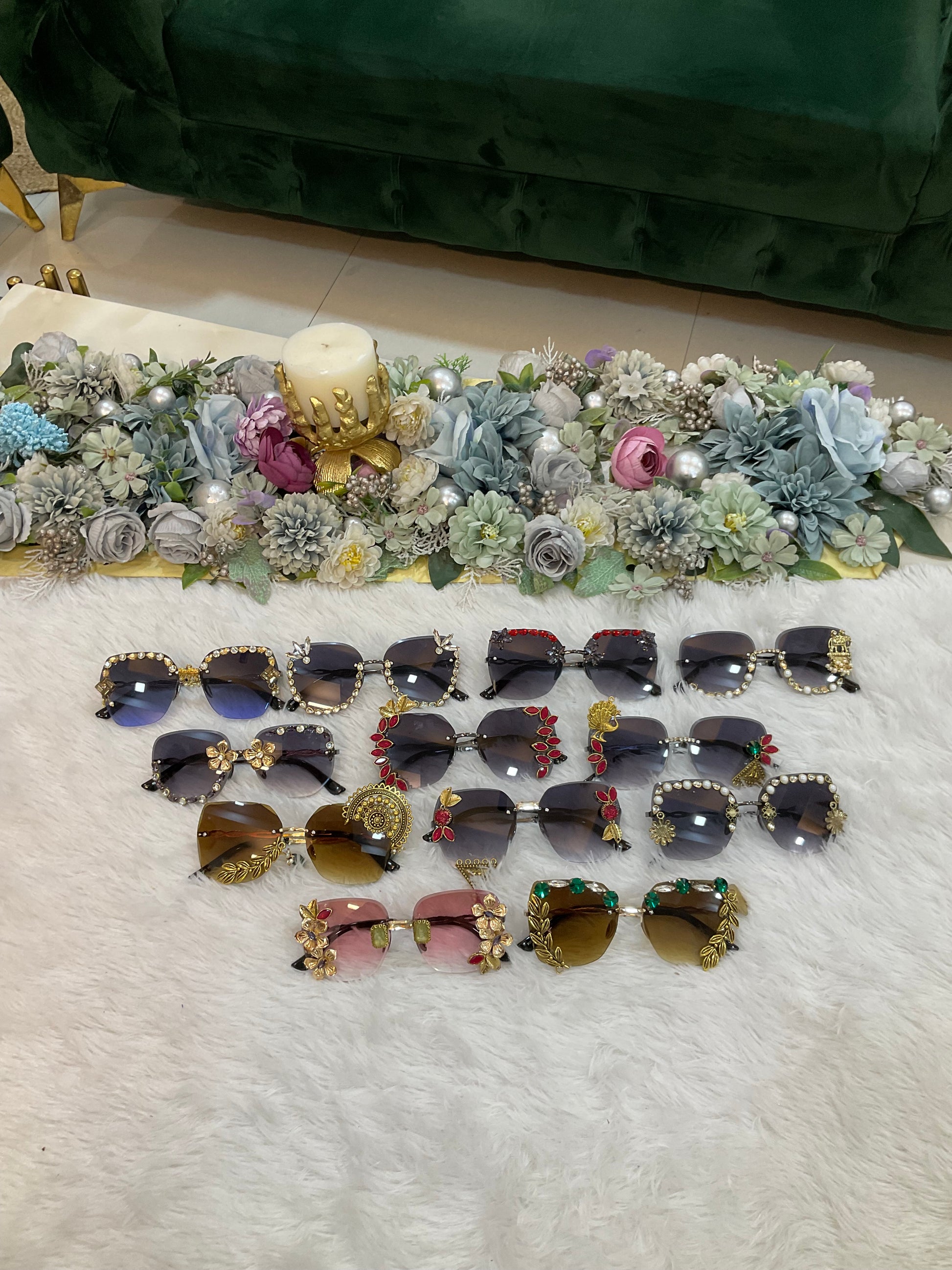 Add a touch of glamour and fun to your Haldi & Mehendi ceremonies with our exclusive Designer Goggles. Specially curated for bridal festivities, these statement sunglasses are adorned with intricate kundan-style embellishments, pearls, floral motifs, and traditional accents, making them perfect for vibrant Indian celebrations.