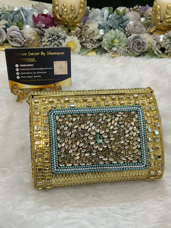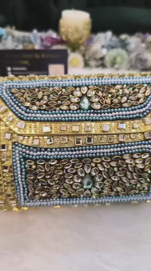 Step into elegance with this stunning designer metal clutch, beautifully handcrafted with intricate beadwork and sparkling stone embellishments. The combination of mint green and gold tones with a hint of emerald accents gives it a royal, festive charm.