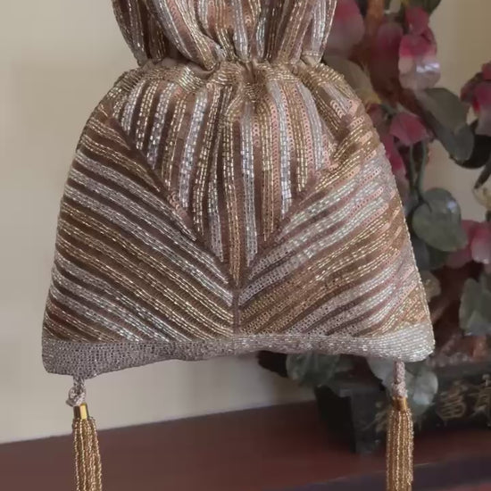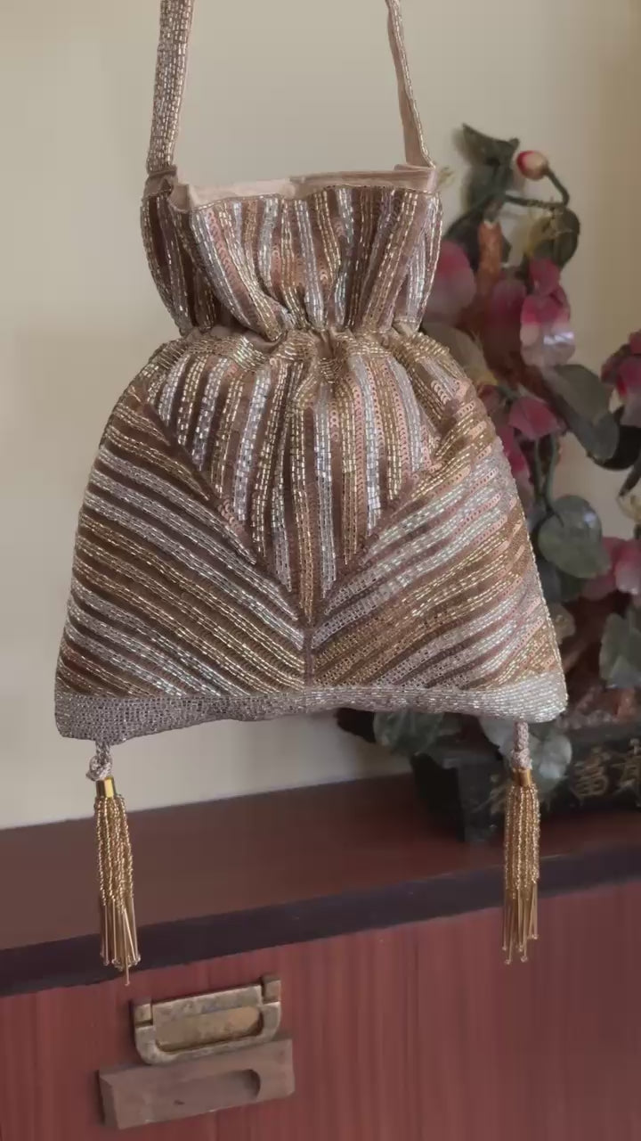 The shimmering gold and silver tones create a luxurious, high-end appearance, while the tasselled drawstrings add a graceful traditional touch. Perfect for brides, bridesmaids, and festive occasions, this potli offers both beauty and durability.