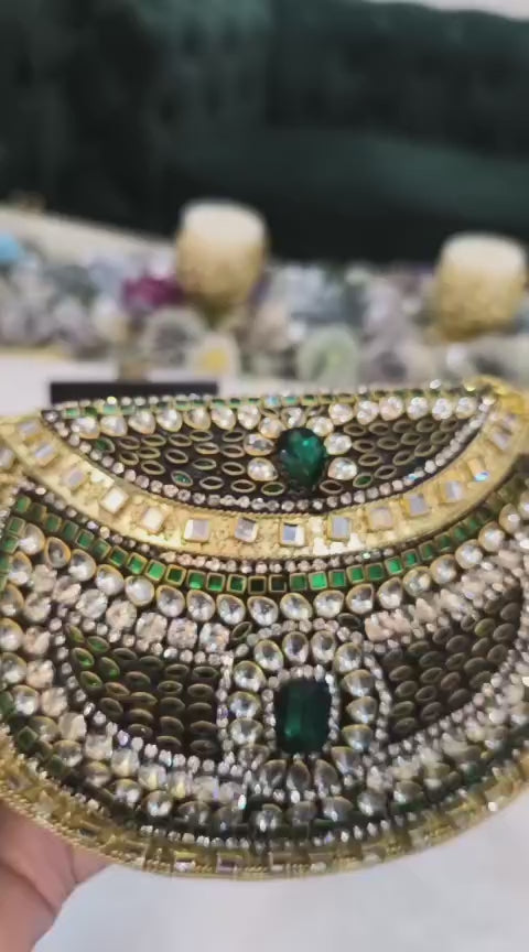 Make a royal statement with this exquisite emerald green metal clutch, handcrafted with intricate Kundan and crystal work. The combination of shimmering gold tones and deep green stones adds a luxurious touch, making it the ideal accessory for festive occasions and weddings.