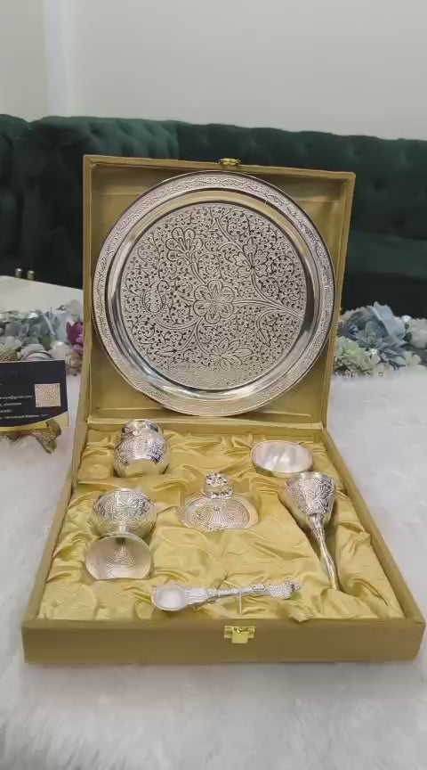 Crafted with precision and packed in a luxurious golden box, this thali set makes an ideal gift for housewarming, weddings, or festive occasions.