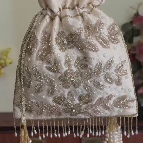 Elevate your ethnic look with this beautifully handcrafted potli featuring intricate floral embroidery in gold bead and pearl work. Designed on a luxurious cream/ivory fabric base, it brings together elegance and festive charm perfectly.