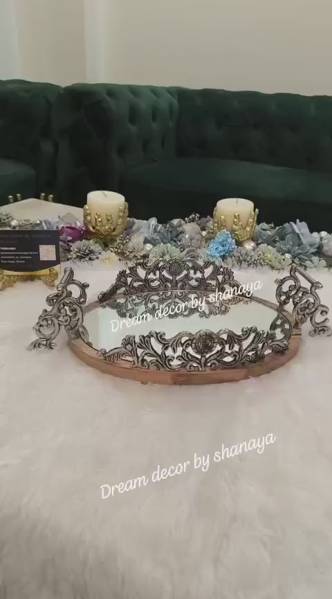 Add a touch of royal elegance to your décor with this exquisite Luxury Mirror Tray. Crafted with a perfect blend of antique silver detailing and a wooden base, this tray exudes timeless charm and sophistication.
