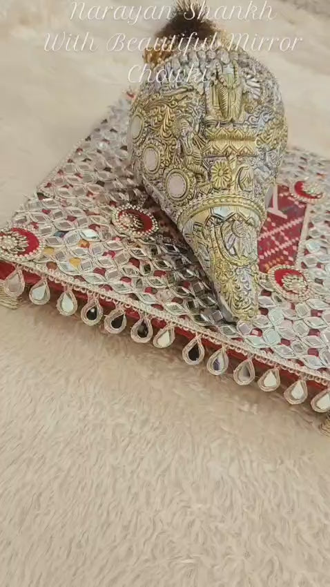A divine symbol of purity, prosperity, and auspicious beginnings, this Hand-Carved Narayan (Vishnu) Shankh is beautifully paired with an intricately embellished mirror work chowki. Crafted with detailed carving and rich mirror accents, this sacred set radiates spiritual elegance and traditional charm.