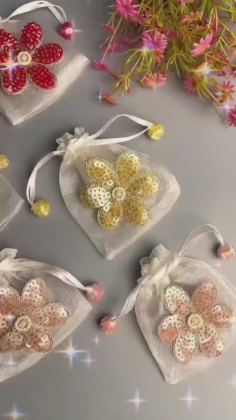 Delicate and elegant, these organza potlis feature a beautiful floral sequin motif at the center, adding a touch of sparkle to any occasion. Crafted from sheer organza fabric, they’re lightweight yet stylish — perfect for gifting or festive packaging.