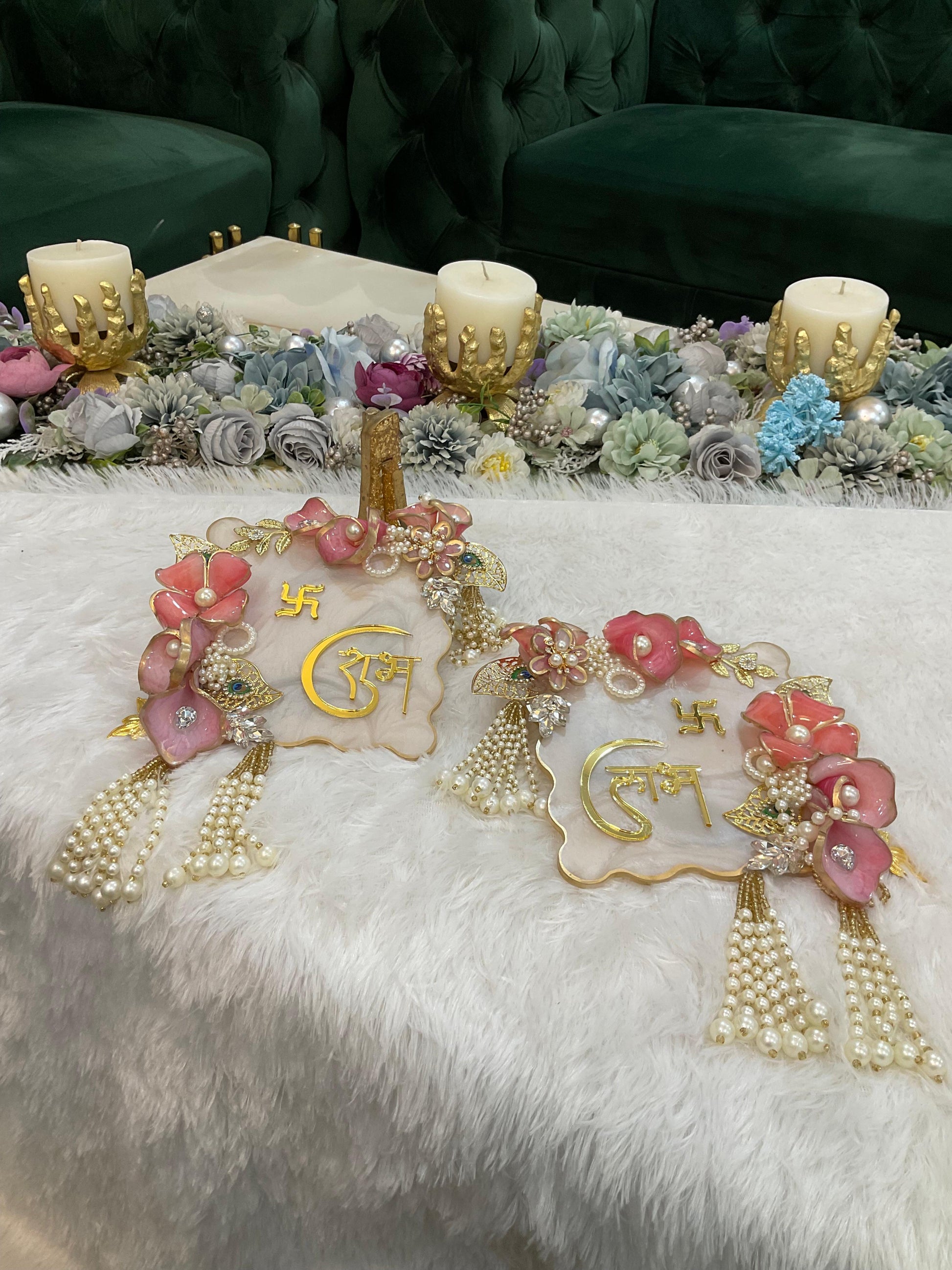 Welcome prosperity and positivity into your home with our exquisite Resin Shubh Labh Set. Handcrafted with premium resin, each piece features elegant gold “Shubh” and “Labh” inscriptions, embellished with intricate resin floral designs and pearls accents.
