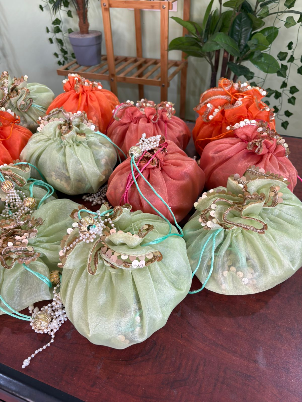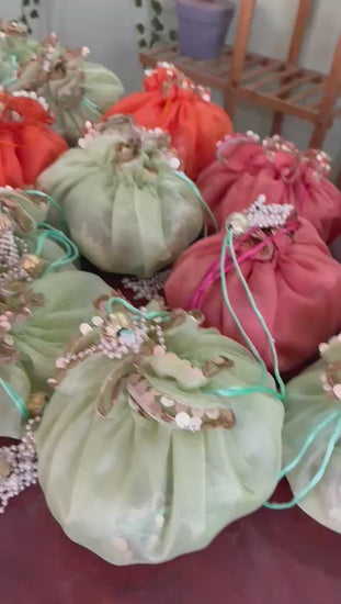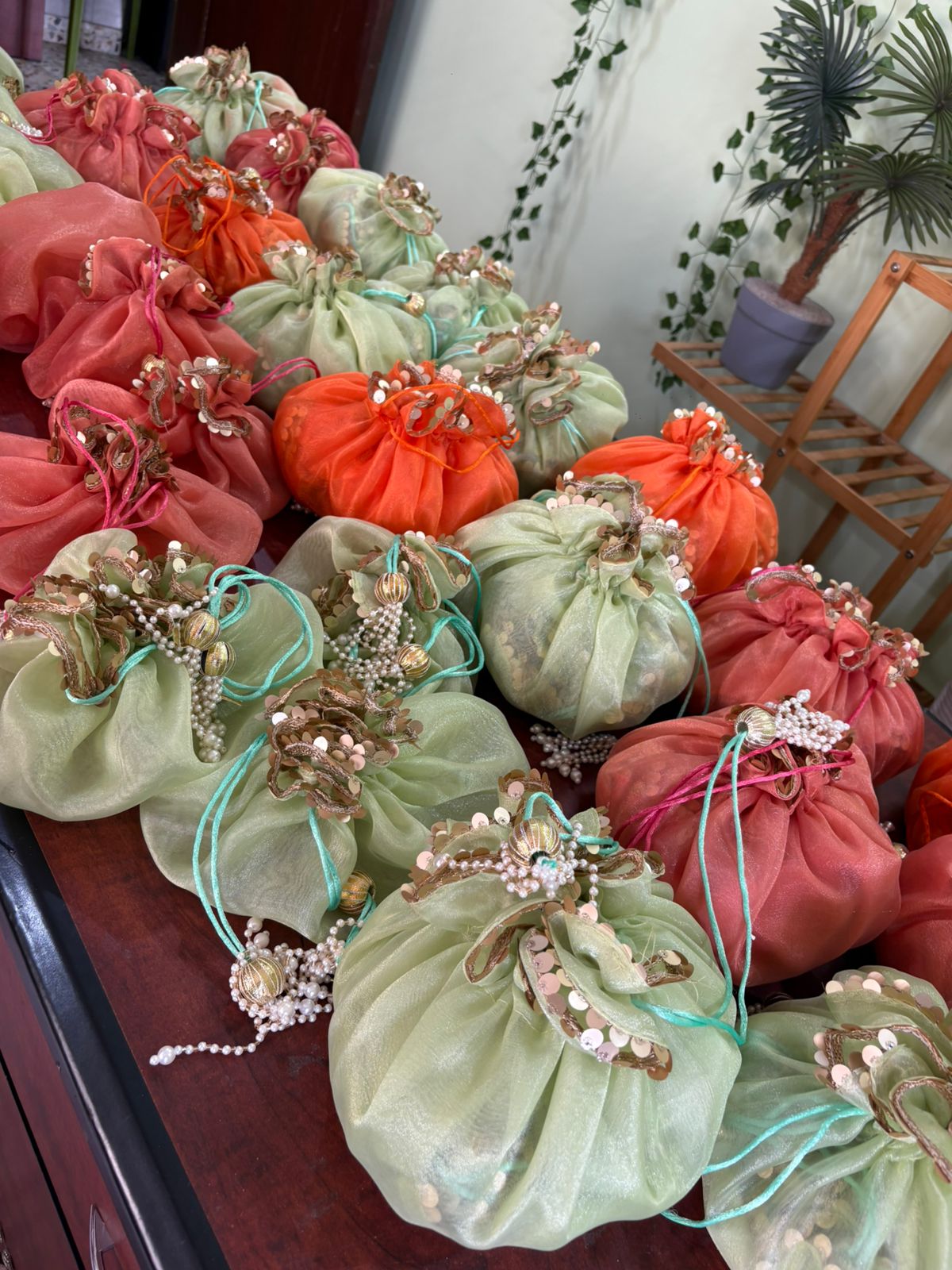 A perfect blend of traditional charm and modern elegance — these potlis elevate any celebration with their radiant, handcrafted finish.