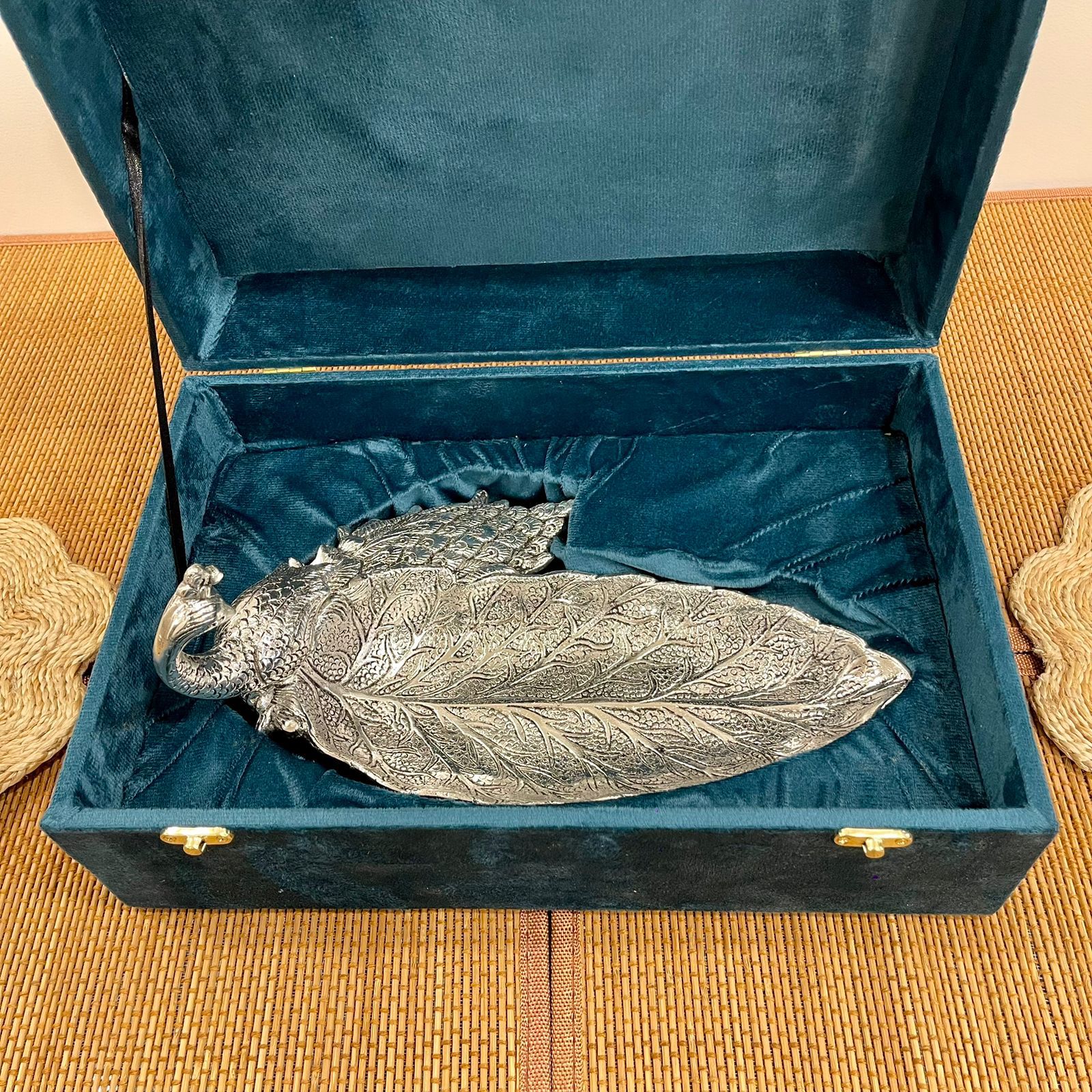 Add a royal touch to your festive serving with this beautifully handcrafted Silver Plated Peacock Dry-Fruit Platter. Designed in an elegant leaf and peacock motif, this platter perfectly blends traditional artistry with modern luxury.