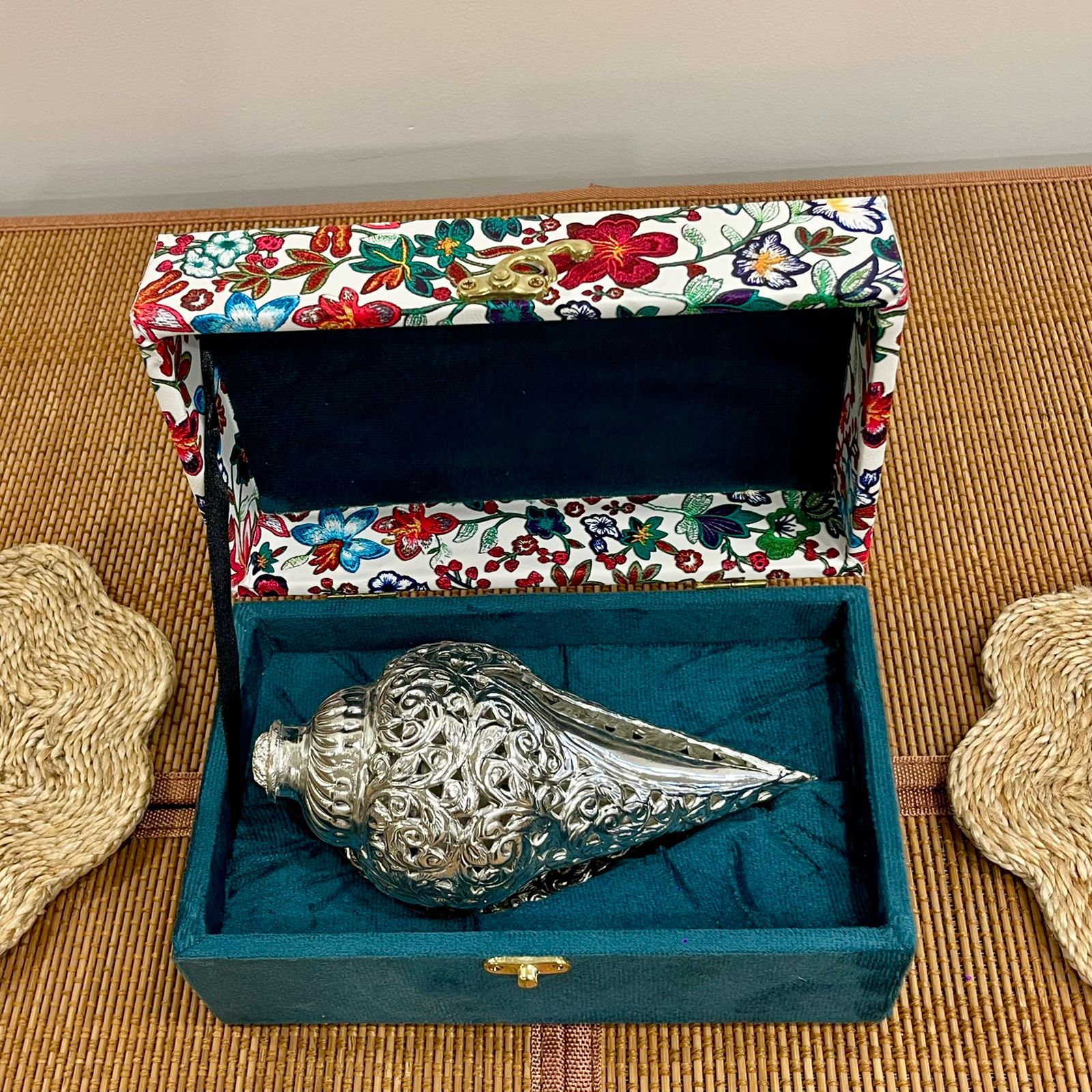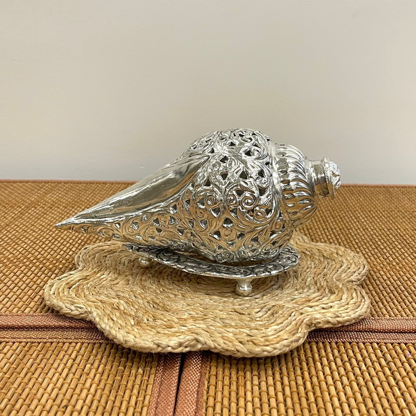 Bring home this exquisitely handcrafted Silver Plated Shankh with Stand, a symbol of purity, prosperity, and divine energy. Beautifully detailed with intricate carving work, this elegant piece adds a touch of traditional charm to your pooja setup or home décor.